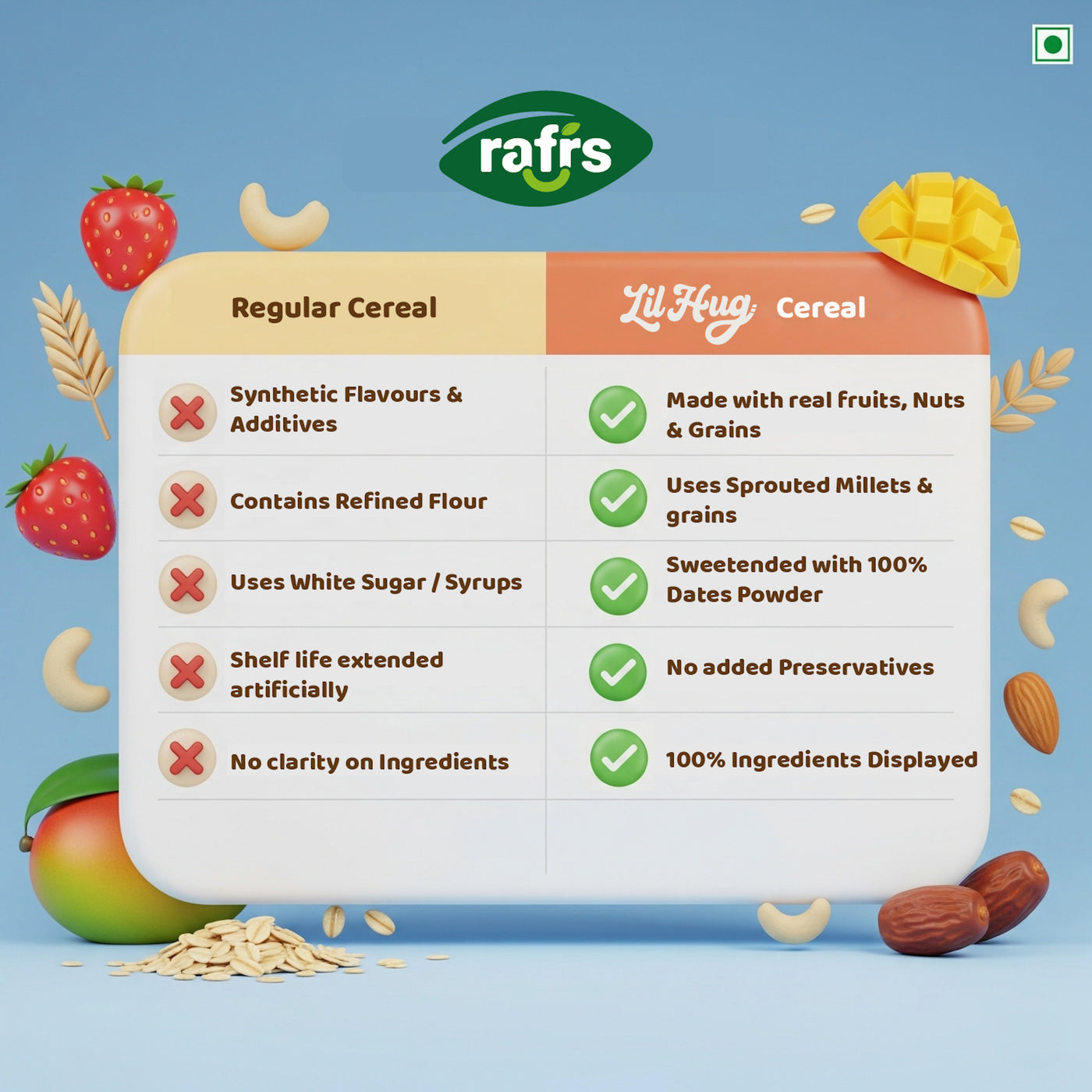 None at all. Our products are made with clean, real ingredients and contain zero preservatives, colours, or synthetic flavours.